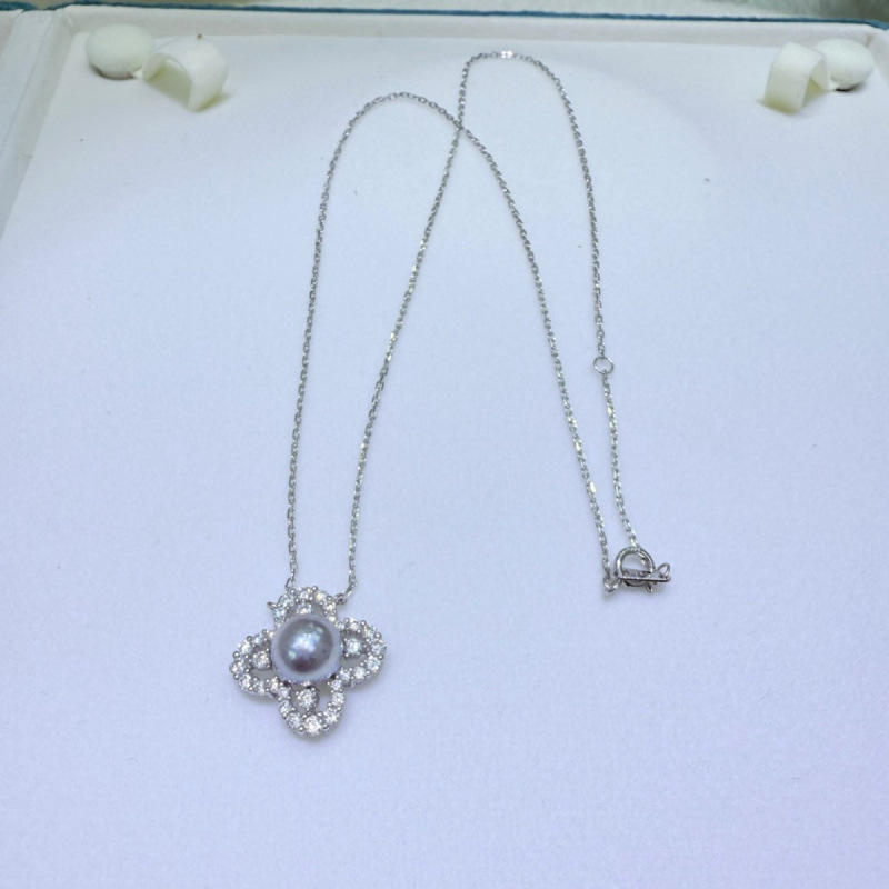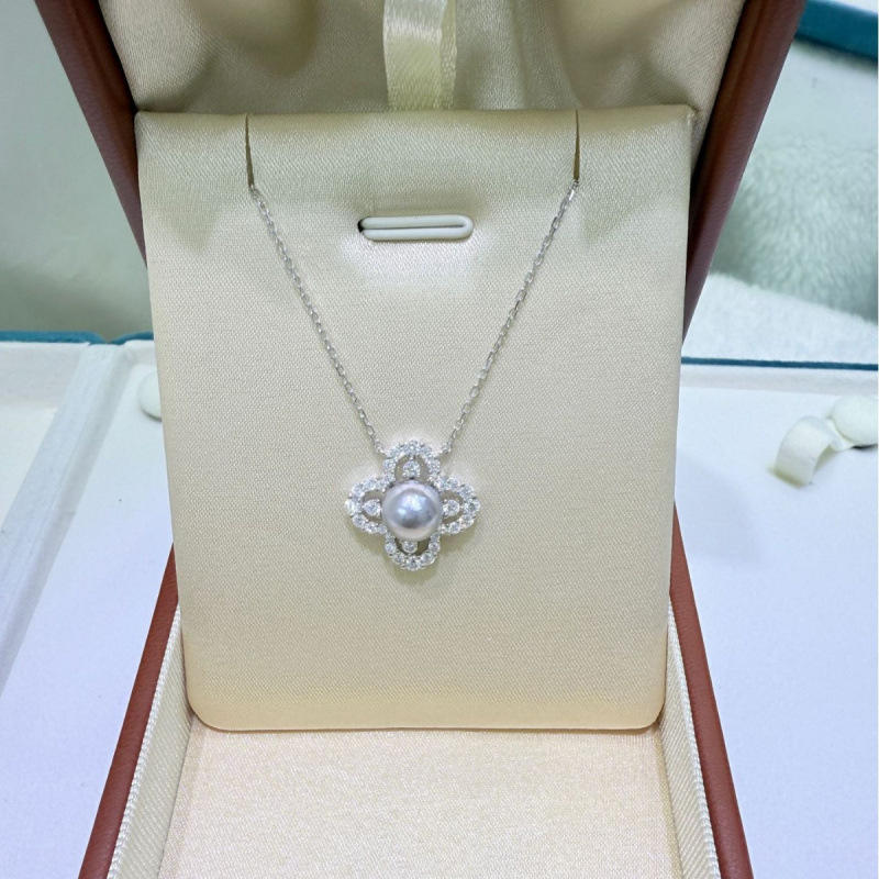 สร้อยคอมุกน้ำทะเลขนาด 8-9 มม. ดีไซน์หรูหรา พร้อมจี้เงินแท้ ประดับด้วยลายใบโคลเวอร์ ดีไซน์เรียบหรู เหมาะสำหรับฤดูใบไม้ผลิ/ฤดูร้อน