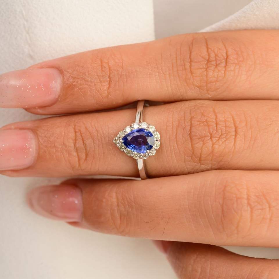 แหวนหมั้นเพชรแซฟไฟร์ตัดลูกแพร์ธรรมชาติทำด้วยมือขนาด14K สีทองขาวสำหรับงานแต่งงาน