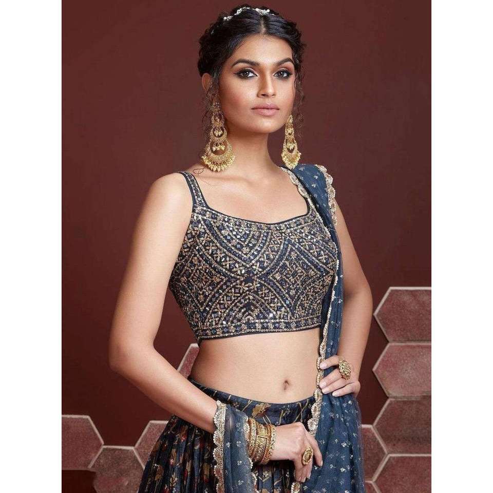 ชุดเลเฮนกาโชลีผ้าไหมชิโนนพิมพ์ลายดิจิทัลสีน้ำเงินสวยงามสำหรับงานปาร์ตี้ แบบกึ่งสำเร็จรูป โดย Zeel Clothing