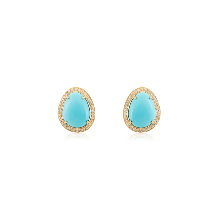 ต่างหูแบบติดหูทรงไม่สมมาตรประดับเทอร์ควอยซ์และเพชรทรงรัศมี ดีไซน์สวยหรู สำหรับคนเกิดเดือนธันวาคม ผลิตตามสั่งจากโรงงาน ทองคำ 14K สีเหลือง