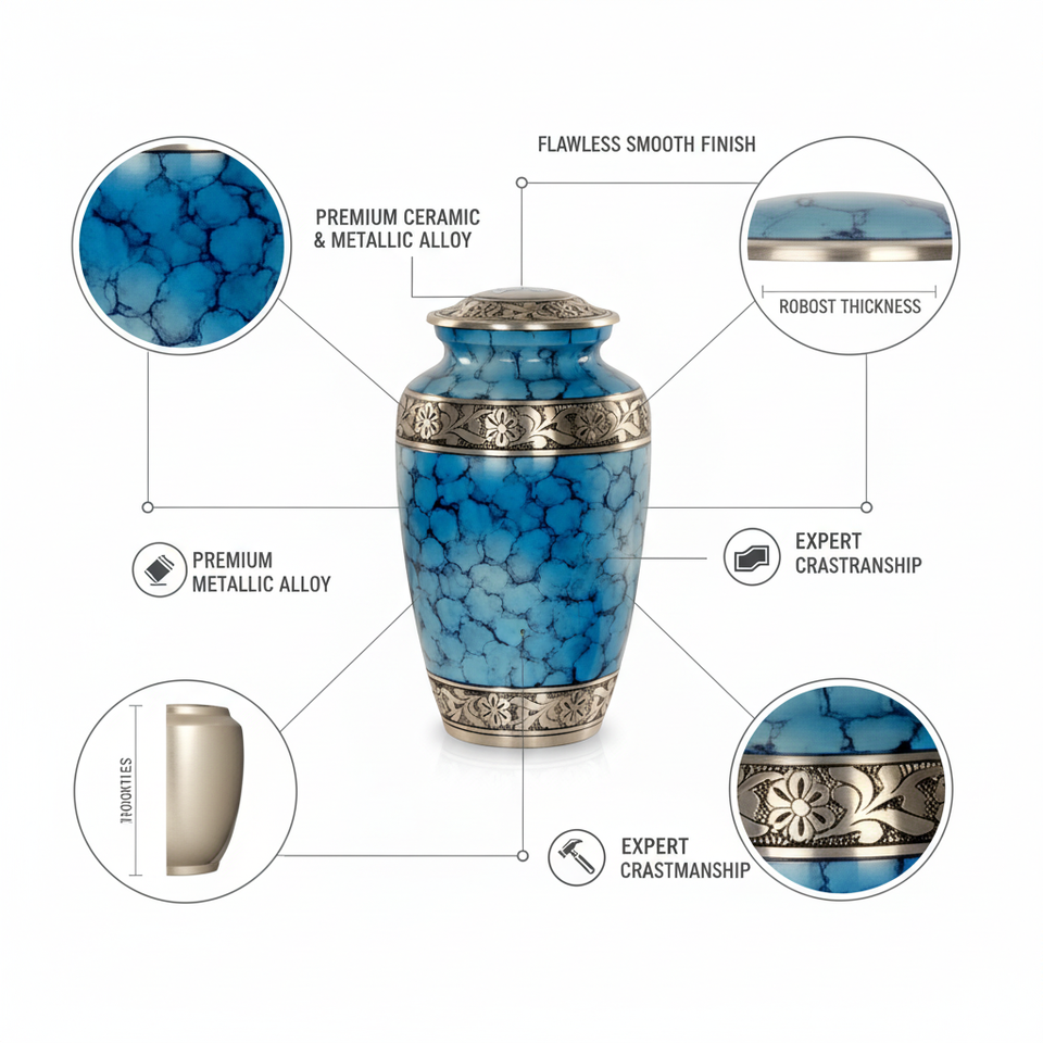 Exquisite European Style Blue Marble Cremation Urn for Human Ashes-Elegant Metal Urn Engraved Details 200 Cubic Inch Capacity