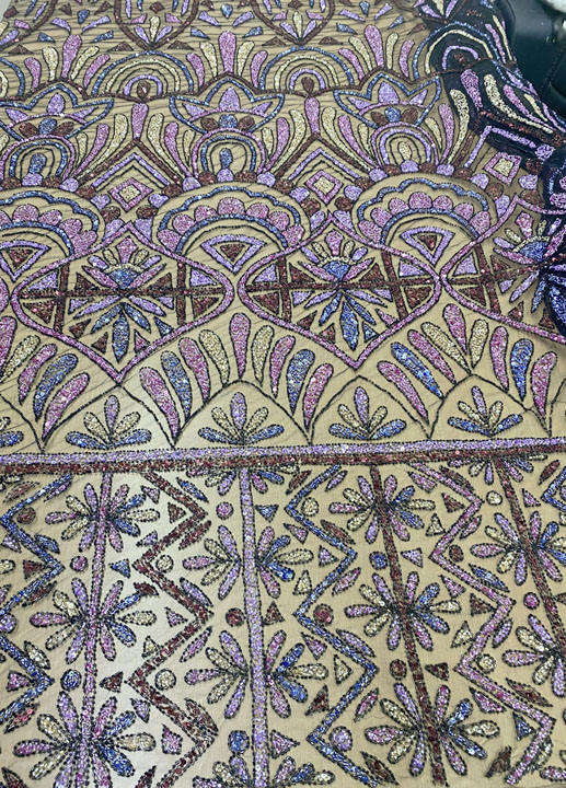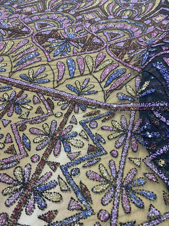 ผ้าลูกไม้ตาข่ายปักมือประณีตประดับด้วยลูกปัดแก้วสีทองและเลื่อมปักลาย สำหรับงานออกแบบแฟชั่นระดับไฮเอนด์และการตัดเย็บเสื้อผ้า