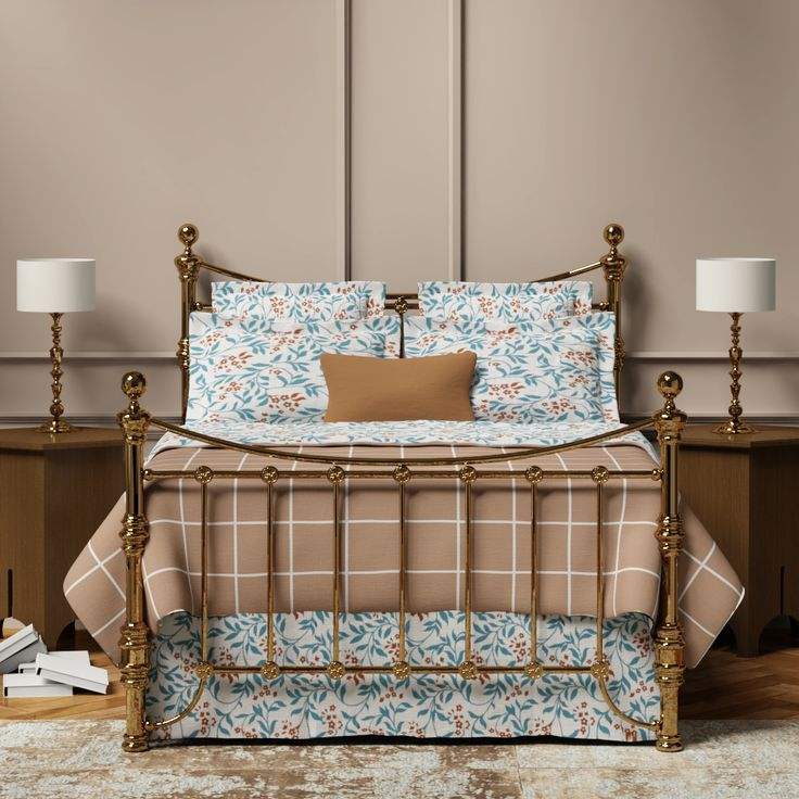 โครงเตียงทองเหลืองงานฝีมือประณีต พร้อมรายละเอียดอันวิจิตร ผิวสัมผัสหรูหรา และโครงสร้างคุณภาพพรีเมียม สำหรับเฟอร์นิเจอร์ห้องนอนสุดหรู