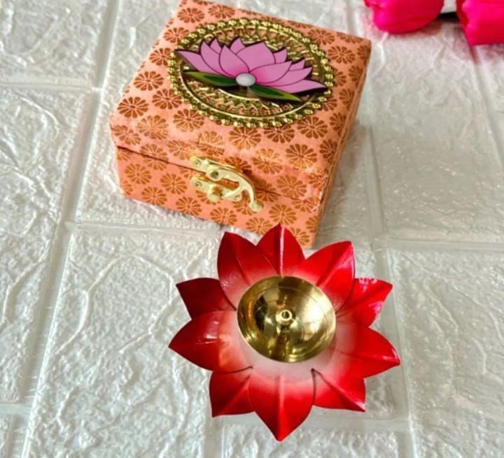 ที่ใส่ตะเกียงรูปดอกบัวโลหะสีแดงสดใส งานฝีมือประณีต จับคู่กับกล่องเครื่องประดับผ้าไหมสีพีชเข้าชุด