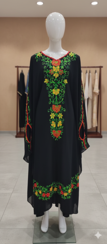 ชุดกะฟตันสีดำกลางคืนสุดหรู พร้อมงานปักลายดอกไม้สีสันสดใสด้วยมือ และรายละเอียดงานฝีมือแบบดั้งเดิม