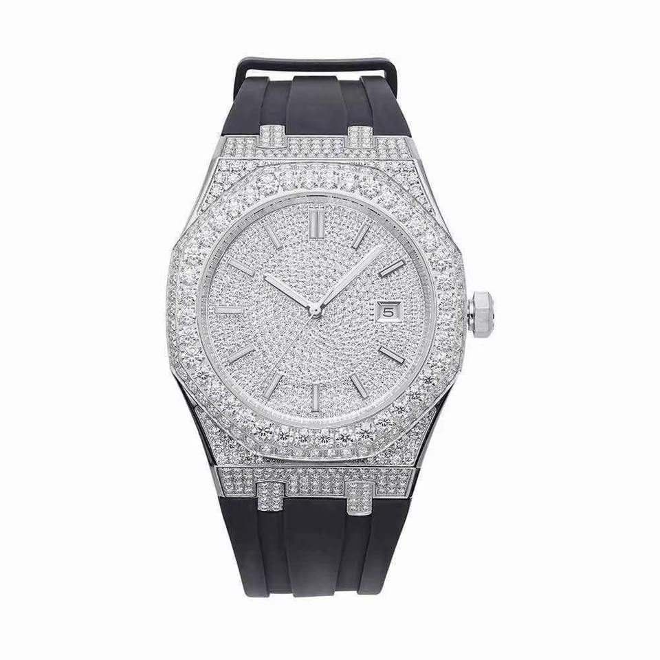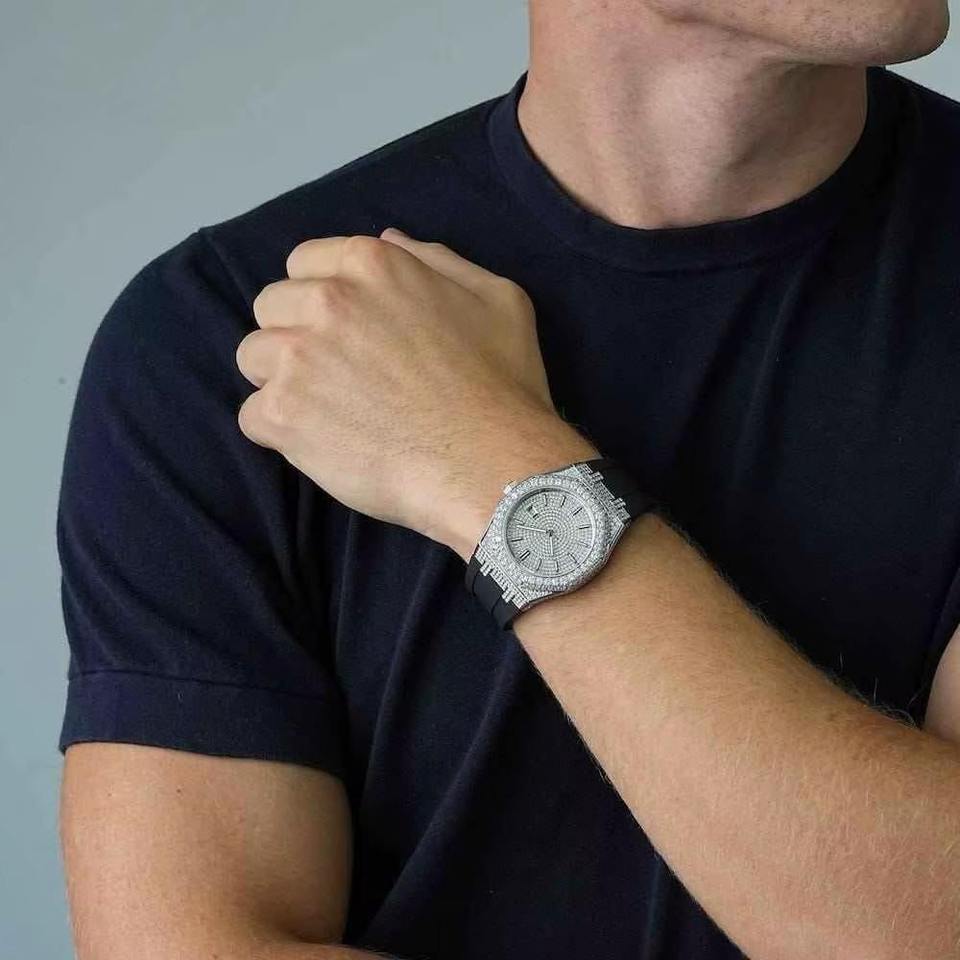 นาฬิกาหรูประดับเพชรโมอิสซาไนต์สุดหรู พร้อมหน้าปัดสวยงามเปล่งประกายและเพชรระยิบระยับ เหมาะสำหรับใส่ในช่วงเย็น