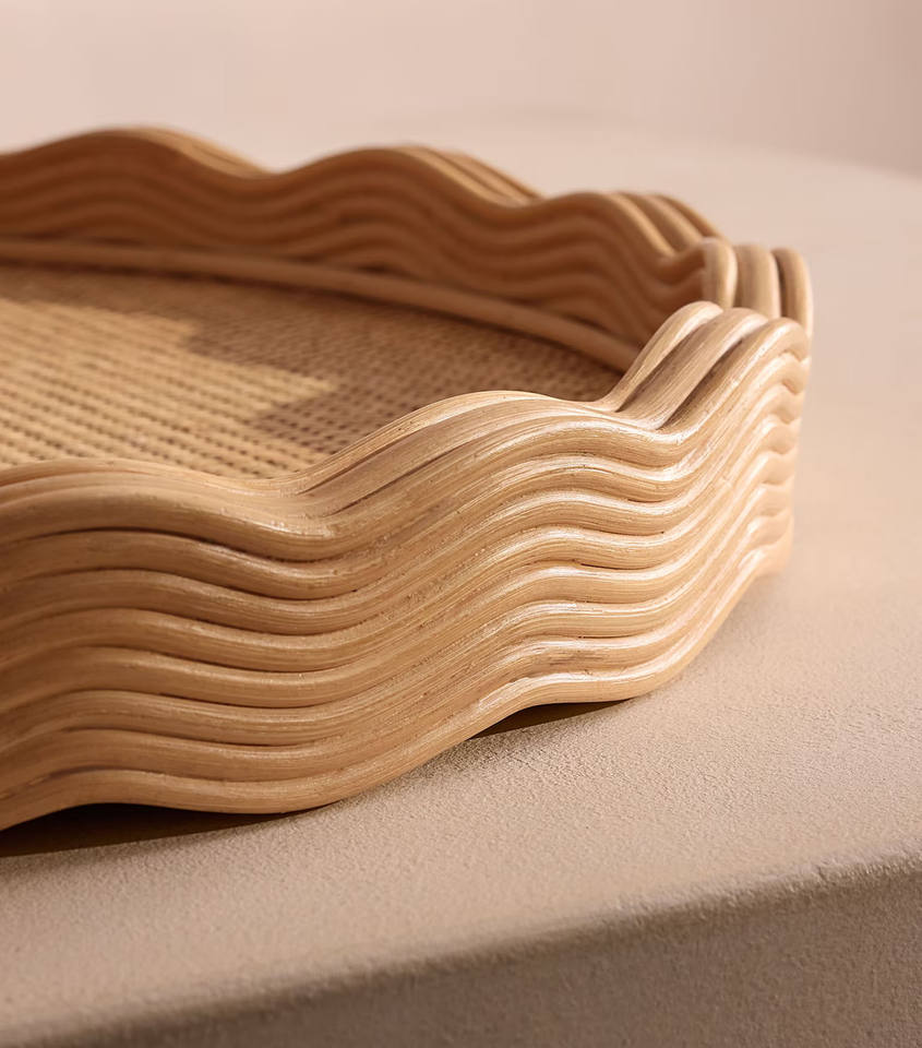 ถาดเสิร์ฟทรงกลมหวายสุดหรู ทำด้วยมือ ถาดโชว์สินค้าหวาย ขอบหยักลายประณีต ของตกแต่งโต๊ะสไตล์คลาสสิก