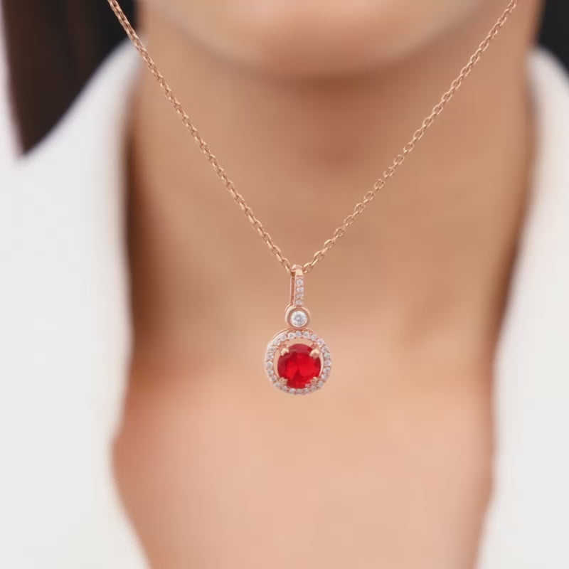 จี้โรสโกลด์สุดหรูบนสร้อยแบบกล่อง พร้อมทองคำขาวชุบโรเดียม 14K ประดับด้วยมอยส์ซาไนต์และทับทิม