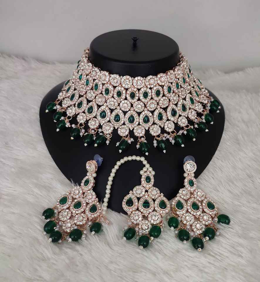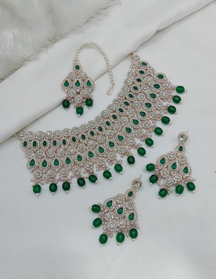 ชุดเครื่องประดับเจ้าสาวชุบทองคำสีกุหลาบสุดหรู ประดับด้วยเพชรซิร์คอน สร้อยคอแบบโชคเกอร์ ต่างหู และเครื่องประดับศีรษะแบบมังติกก้า สำหรับงานหมั้น สไตล์ชาติพันธุ์