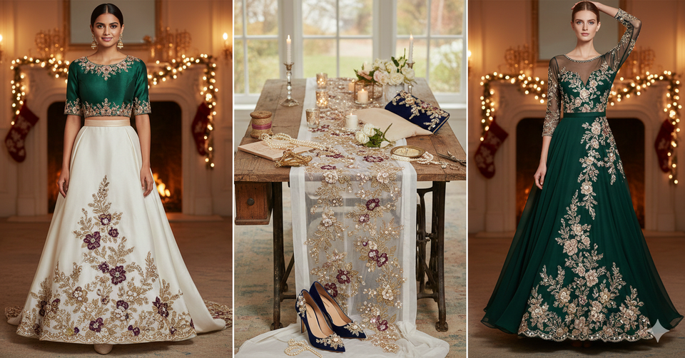 ลูกไม้ปักลายดอกไม้หลากสีแบบดั้งเดิม ประดับด้วยมุก ลูกปัด ด้ายเมทัลลิกซารี ลูกปัดวิบวับ 100% โพลีเอสเตอร์