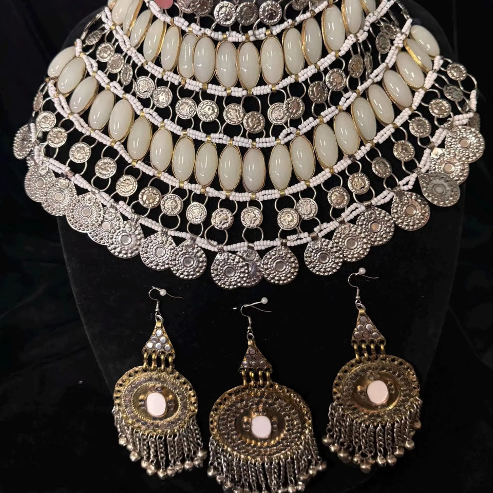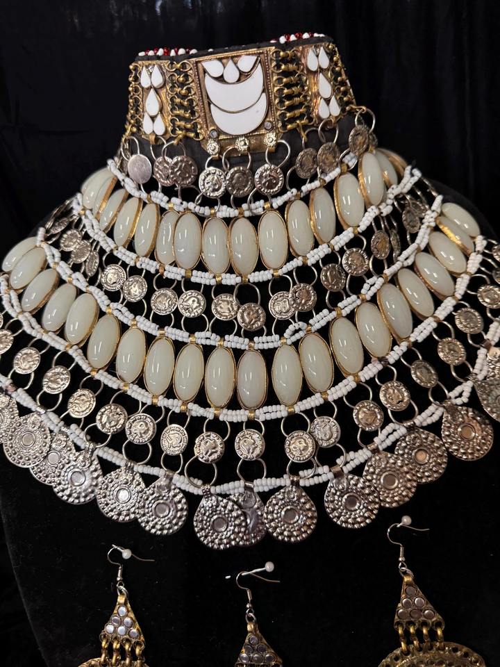 สร้อยคอเส้นใหญ่แบบดั้งเดิมของชนเผ่าที่มีลูกปัดรูปไข่สีขาวมันวาวหลายแถวจัดเรียงอย่างประณีต
