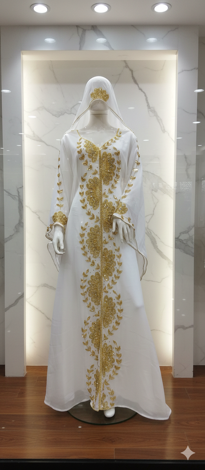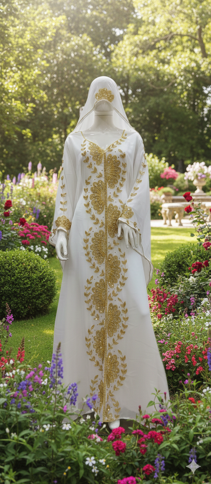 ชุดกะฟตันผ้าชีฟองสีขาวสุดหรู พร้อมงานปักลายดอกไม้สีทองอย่างประณีต และผ้าคลุมหน้าที่เข้าชุดกัน – ชุดเจ้าสาวสุดหรูและชุดสำหรับโอกาสพิเศษ