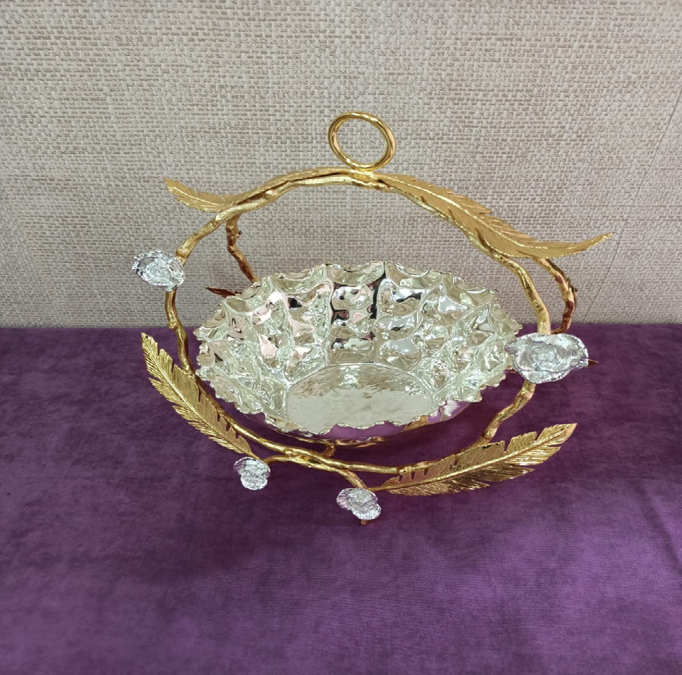 ชามสีเงินสุดหรูหราประดับด้วยโครงไม้ประดับใบไม้สีทองและพวงมาลัยดอกไม้ มีจำหน่ายในราคาขายส่ง