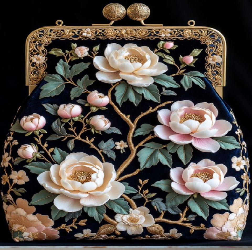 กระเป๋าทรงหยดน้ำสุดหรู ประดับด้วยลูกปัดดอกไม้สีชมพู 3 มิติ และตกแต่งด้วยสีทอง มีจำหน่ายในราคาขายส่ง