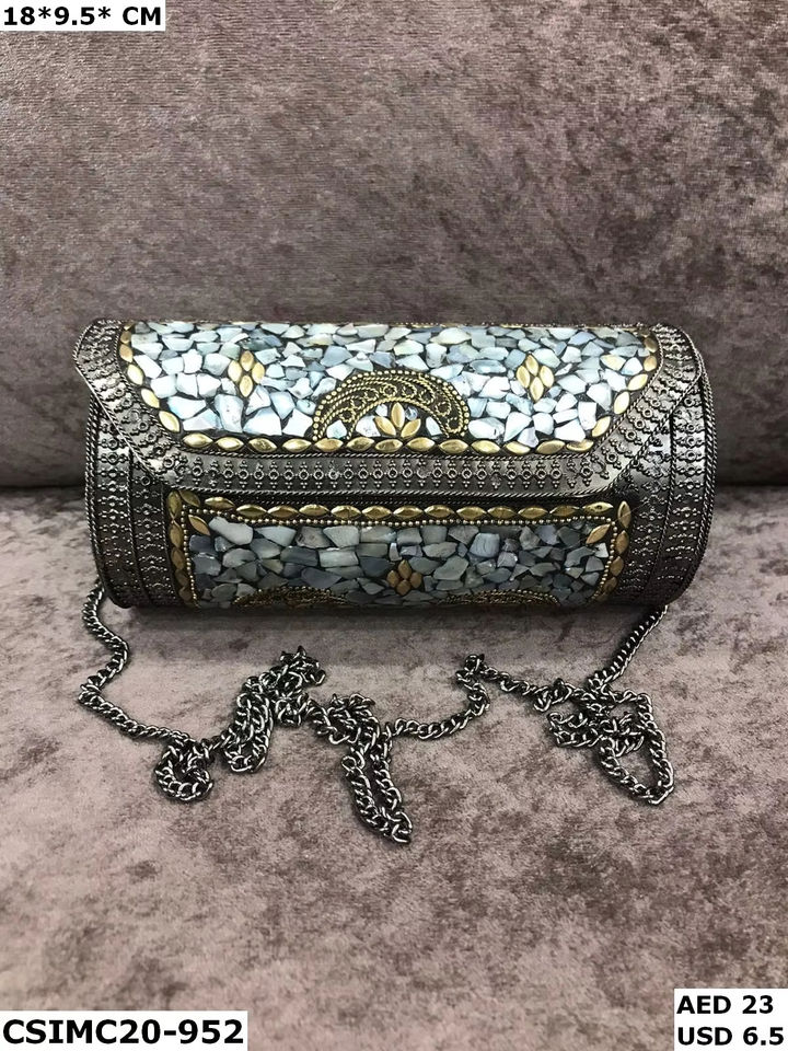 กระเป๋าคลัทช์งานฝีมือประณีต ดีไซน์เนอร์ออกแบบ ตกแต่งด้วยโลหะโมเสก ผลิตในอินเดีย เหมาะสำหรับสุภาพสตรีในงานเลี้ยงตอนเย็น