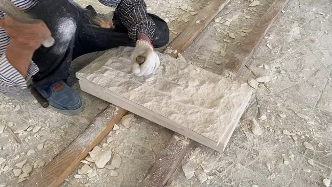 ผนังหินปูนสีเบจลายแกะสลัก