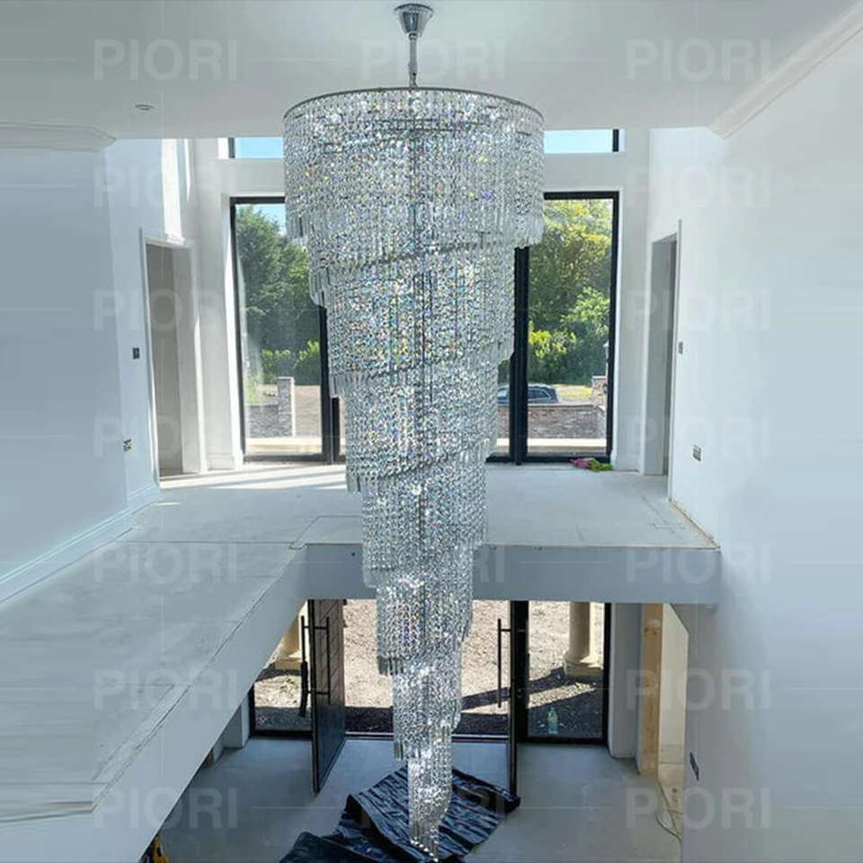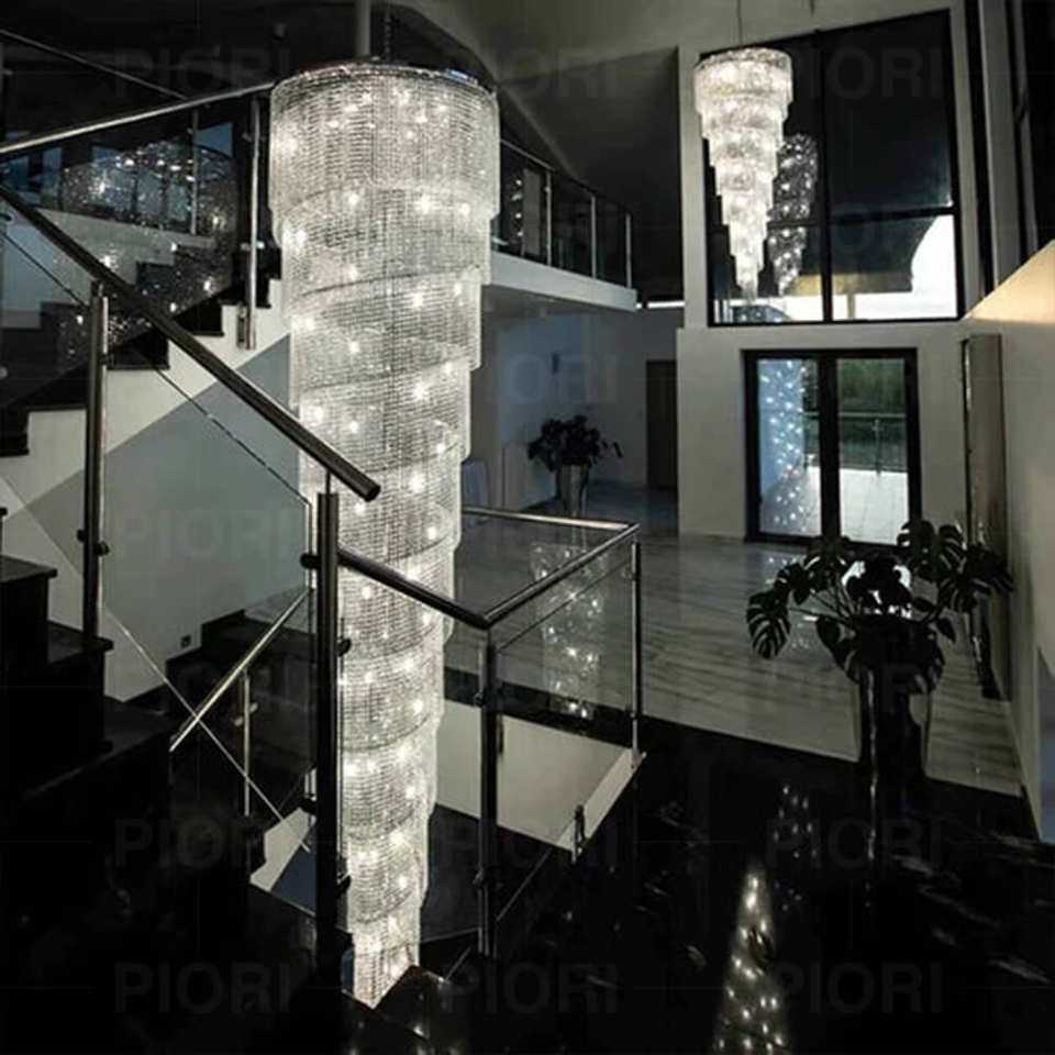 โคมไฟระย้าคริสตัลทรงยาวแบบเกลียวขนาดใหญ่พิเศษ พร้อมพู่คริสตัลหรูหรา สำหรับบันได/ทางเข้า