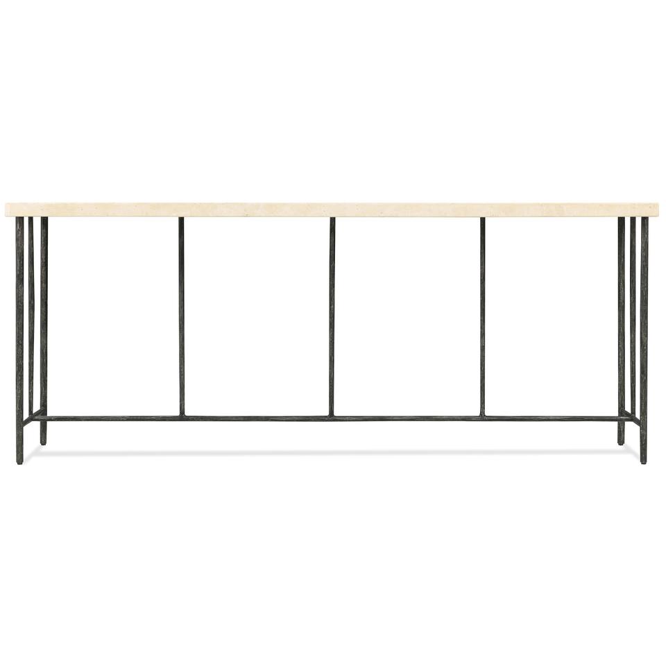 โต๊ะคอนโซลห้องนั่งเล่นทรงยาวพิเศษ ดีไซน์ทันสมัย หน้าโต๊ะลายหินอ่อนสีครีม ขาโลหะสีดำ ดีไซน์มินิมอล