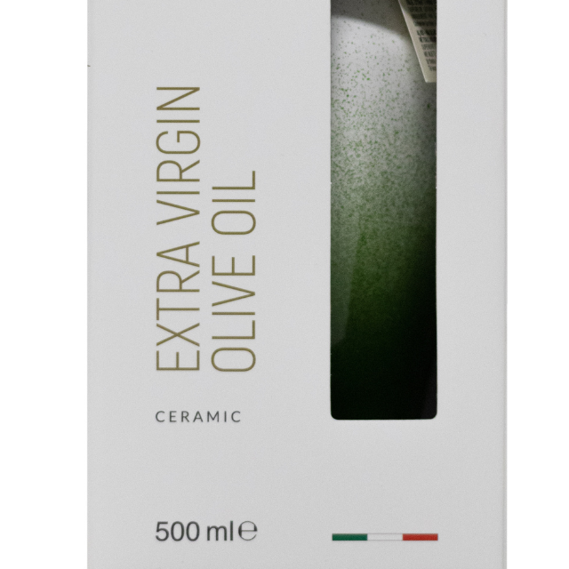 น้ำมันมะกอกบริสุทธิ์สกัดเย็นจากอิตาลี100% ในมือเซรามิกเคลือบด้วยหินสีเขียวและสีขาวขนาด500มล.
