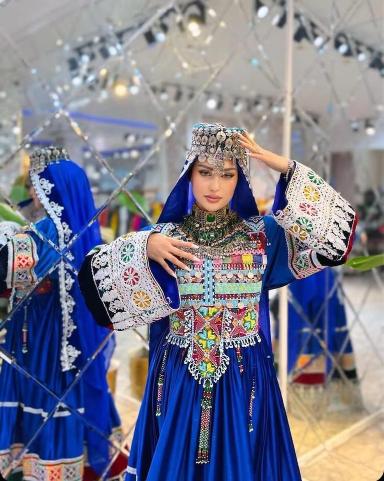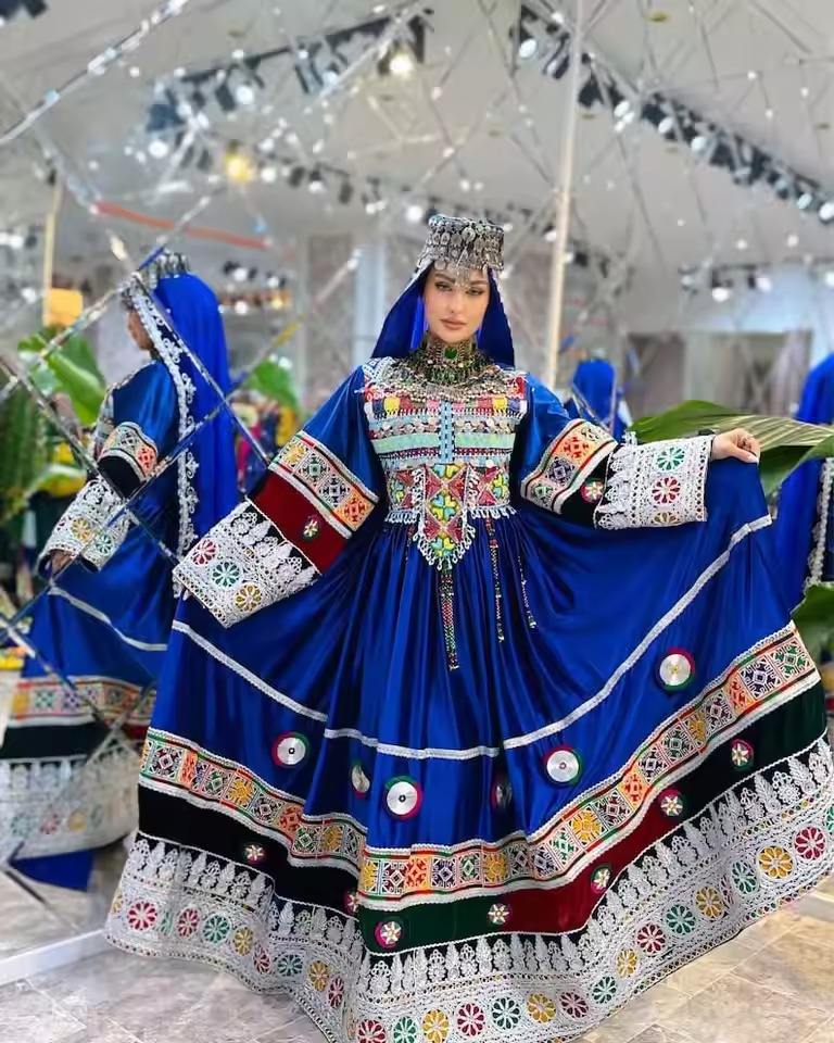 ชุดเดรสอัฟกันทรงเอไลน์กว้างพิเศษ สีน้ำเงินสด ผ้าไหมปักลายหนักแน่น สไตล์ชนเผ่า โปชาค ชุดเดรสแบบดั้งเดิมสำหรับงานพิธีการ