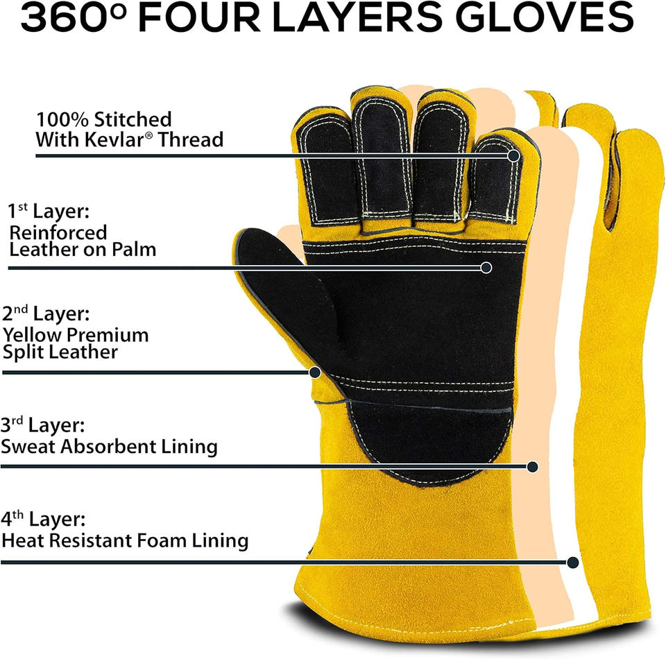 ถุงมือเชื่อมหนังวัวแยกชิ้นทนความร้อนสูงถุงมือป้องกันความปลอดภัยสำหรับใช้ในอุตสาหกรรมเคฟลาร์