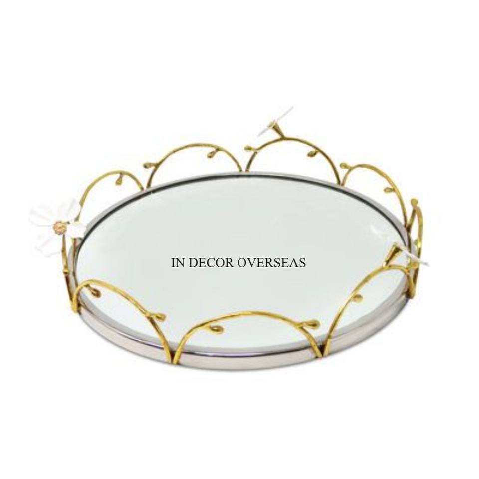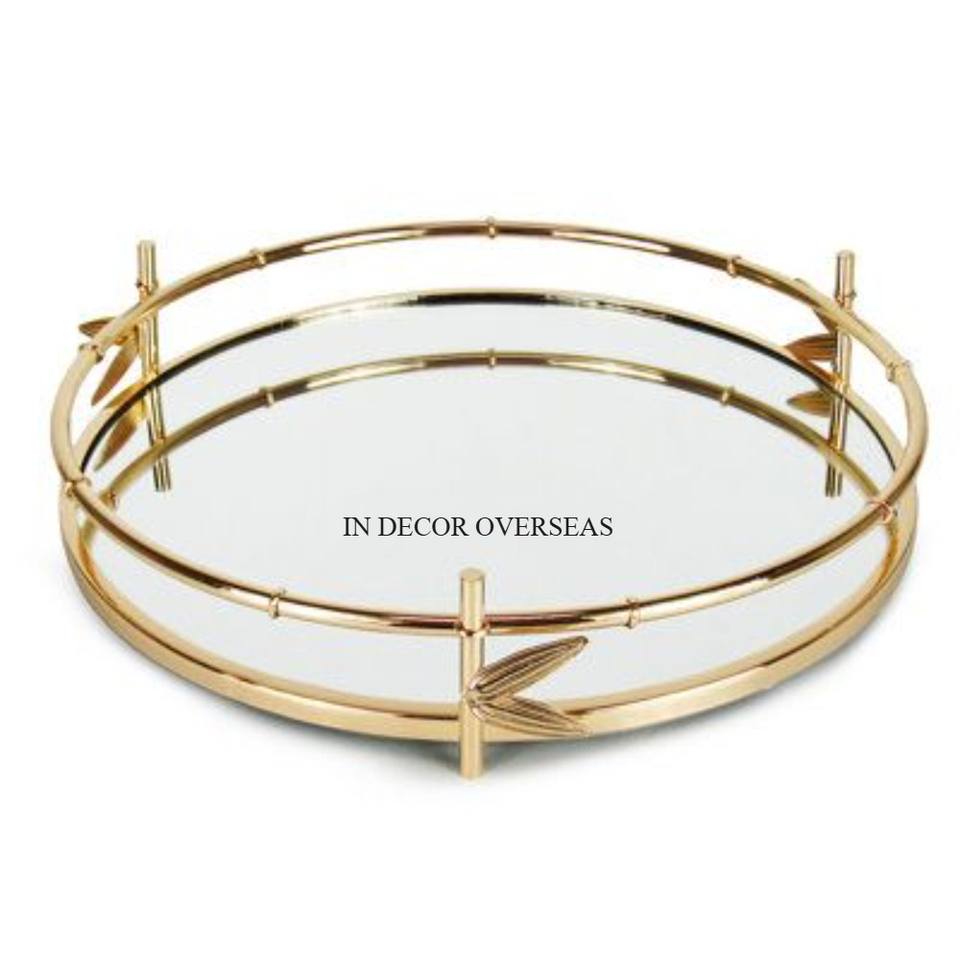 ถาดรองรับกระจกทรงกลมทำจากโลหะเคลือบสีทองที่วางกลางโต๊ะและอุปกรณ์ตกแต่ง