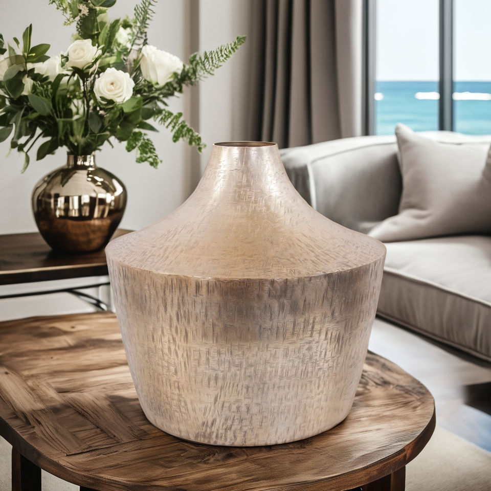 แจกันดอกไม้โลหะอลูมิเนียมสำเร็จรูปสีเงินที่สะดุดตารูปทรงกลมสำหรับตกแต่งโต๊ะรับประทานอาหารที่บ้านแจกันจัดดอกไม้