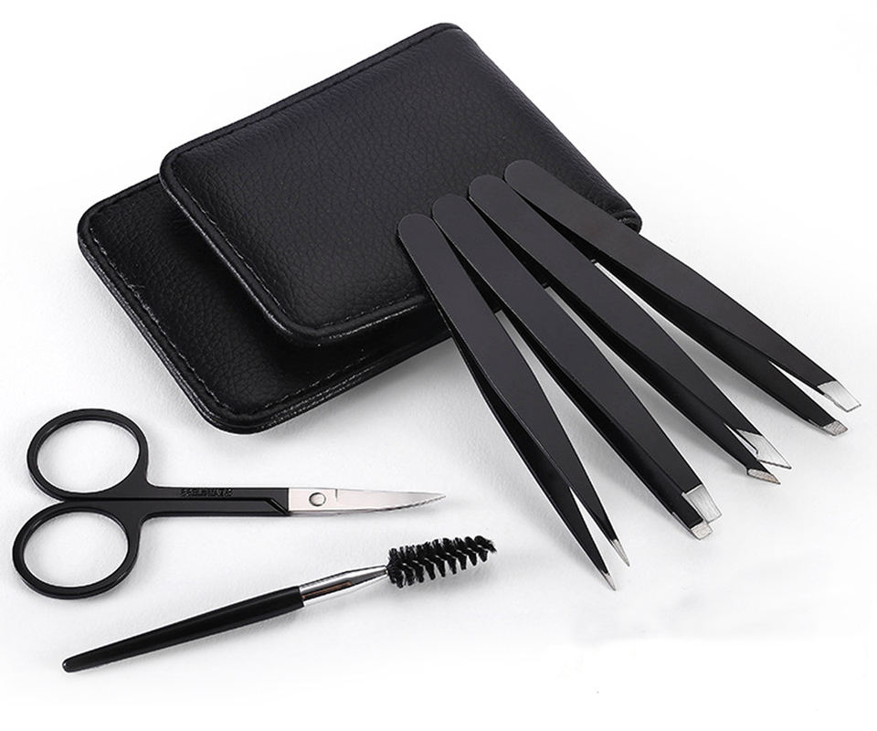 ชุดแหนบคิ้วพร้อมแหนบ4อันและกรรไกร1อันพร้อมแปรงปัดขนตา1อันกล่องเก็บคิ้วสีดำ