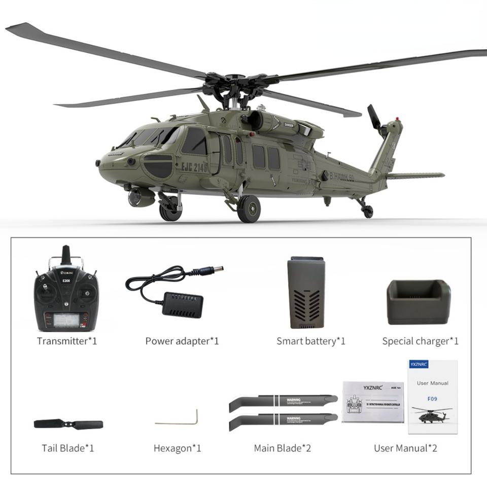 F09 UH60สีดำเหยี่ยว2.4กรัมระบบ3D6G 6CH มอเตอร์ขับเคลื่อนแบบไร้แปรงถ่านไร้ใบพัดโดยตรงเฮลิคอปเตอร์ RC สเกล1:47