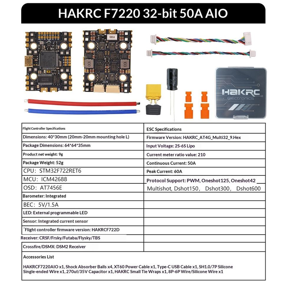 ตัวควบคุมการบิน AIO 50A แบบ F722เอาต์พุตแรงดันสูงแบบบูรณาการสำหรับโดรนแข่งขัน FPV