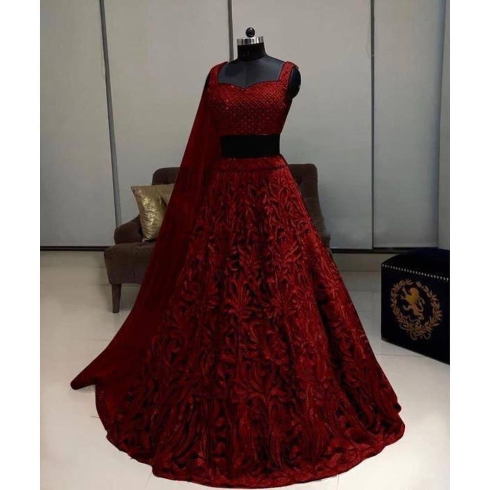 Lehenga choli งานออกแบบปักตาข่ายอย่างยอดเยี่ยมกับ dupatta Maroon
