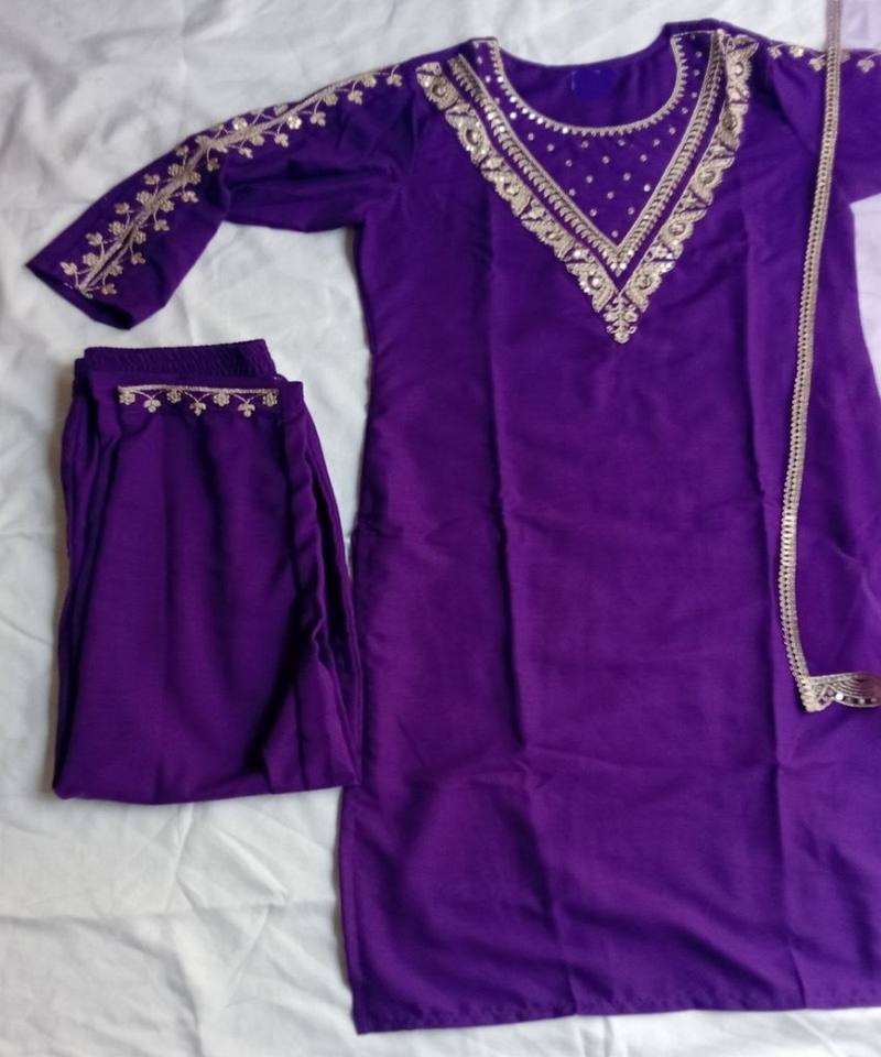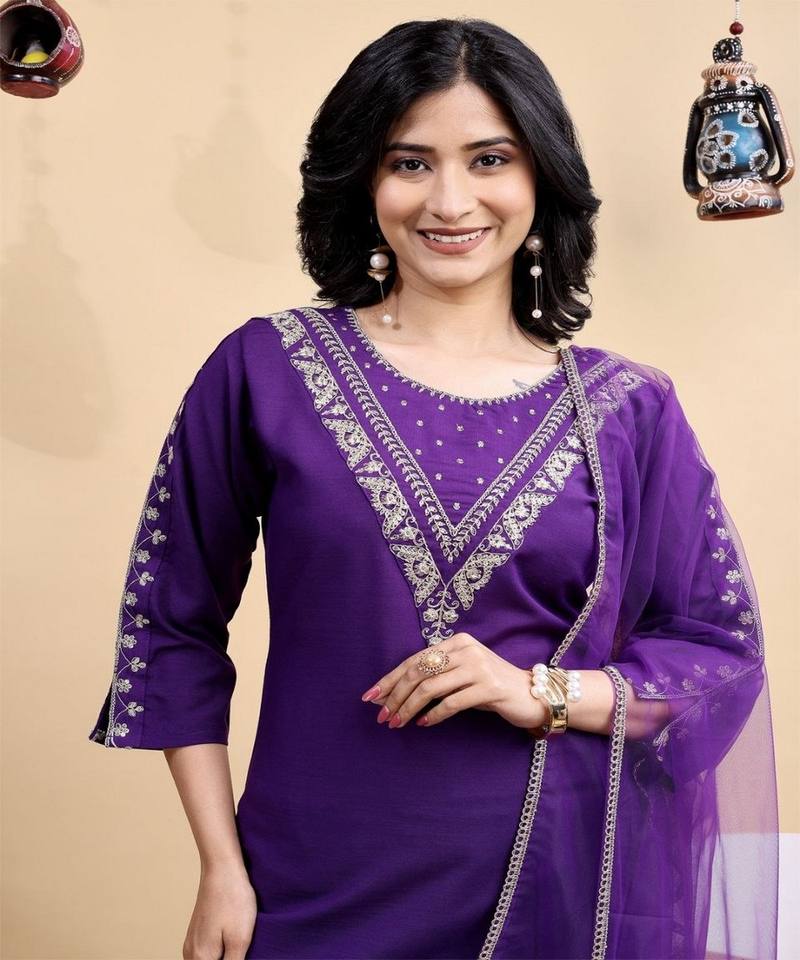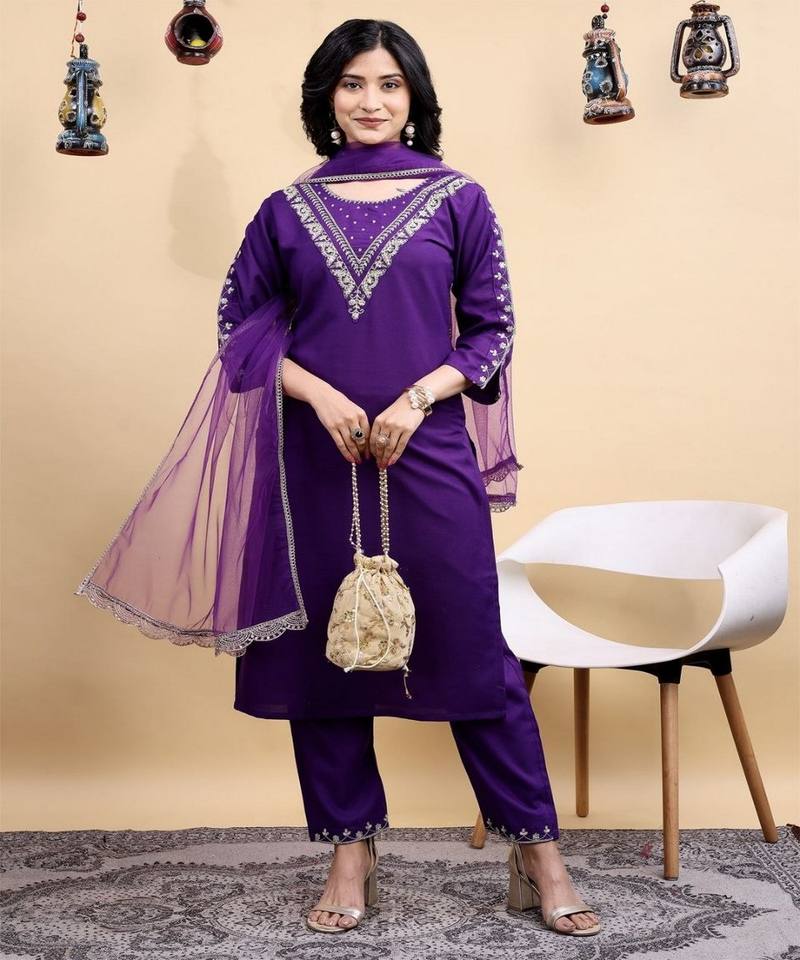 ชุดเสื้อผ้าปักลายแฟนซีผ้าฝ้ายผสม พร้อมกางเกงและผ้าคลุมไหล่ สำหรับงานเทศกาล ราคาขายส่ง เสื้อผ้าชาติพันธุ์ สีม่วง