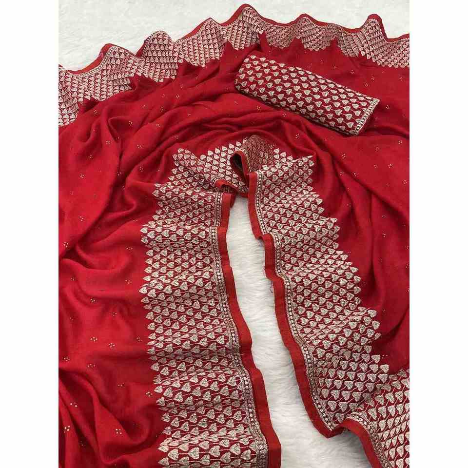 ด้ายวิชิตราซาริแต่งลายดอกไม้ประดับด้วยหินสีแดง