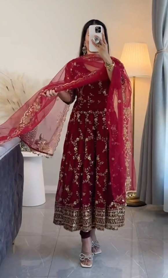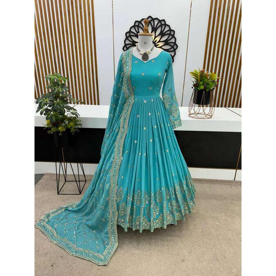 ชุดเดรสยาวทรงเอไลน์สไตล์วินเทจ ผ้าชีฟองปักลายหรูหรา ประดับคริสตัล พร้อมผ้าคลุมไหล่แบบวาดลายสีฟ้าอ่อน เอวทรงธรรมชาติ