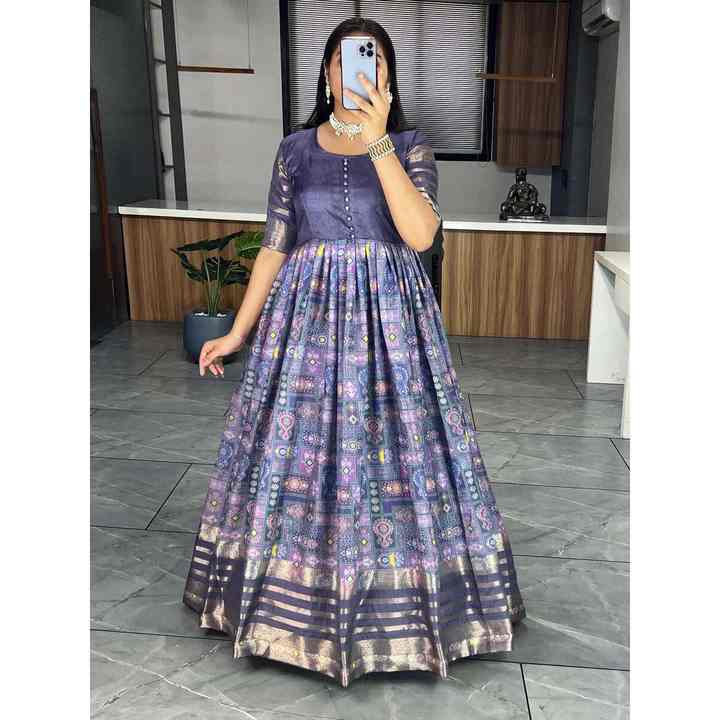 ชุดราตรีผ้าคอตตอนสีม่วงพิมพ์ลายดอกไม้ผ้าคอตตอนแฟนซี