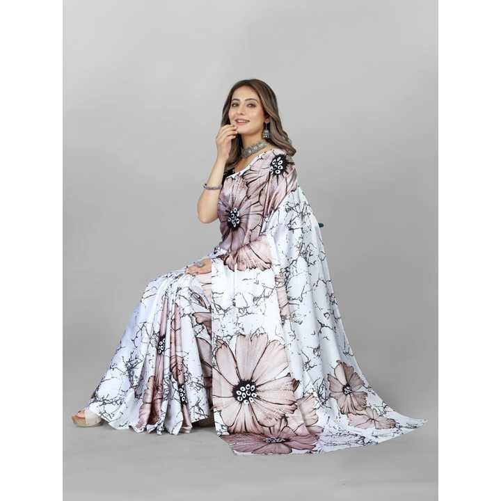 ชุดส่าหรีพิมพ์ลายดิจิทัลผ้าเครปสไตล์ญี่ปุ่นเสื้อสีขาว