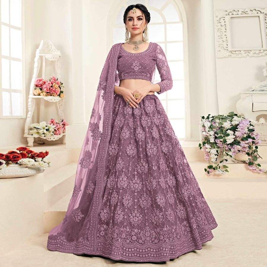 Lehenga choli กับลาเวนเดอร์ dupatta ห่วงโซ่ตาข่ายแฟนซี