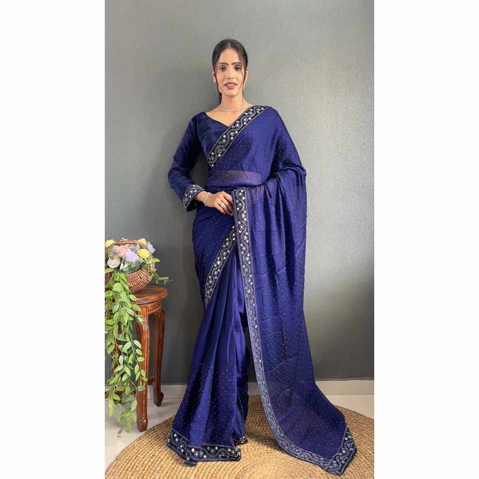 งานลูกไม้ผ้ากำมะหยี่กระจก Swarovski ผ้าไหม rangoli สวยงามพร้อมที่จะสวมใส่ Saree กับเสื้อ unstitched สีน้ำเงินเข้ม