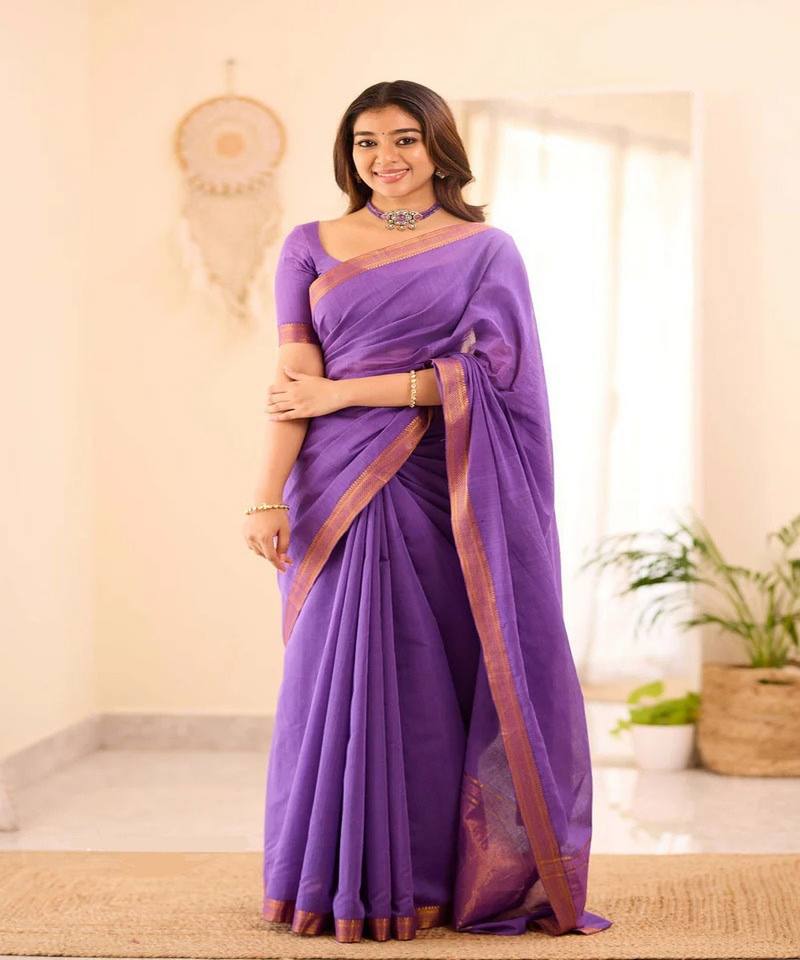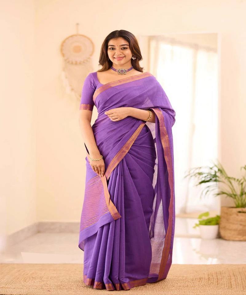 ผ้าซิ่นแฟนซีลายเรียบผ้าฝ้ายใต้ พร้อมงานปักลายคลื่น ชุดส่าหรีพร้อมเสื้อคลุมแบบยังไม่เย็บติดกัน สำหรับงานปาร์ตี้ งานแต่งงาน งานเฉลิมฉลอง ชุดพื้นเมือง สีม่วง