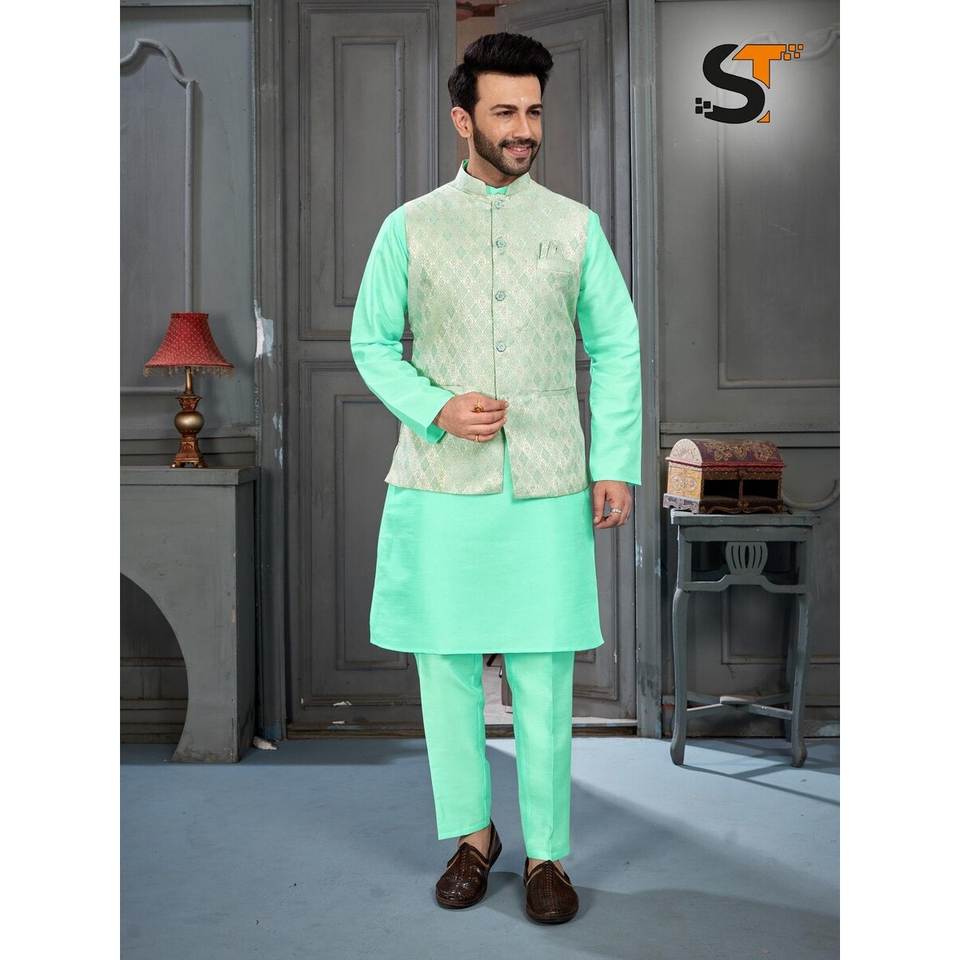 แฟชั่น banglori Silk zari กางเกงทำงานผู้ชาย kurta POLO กับ Koti สีเขียวน้ำทะเล
