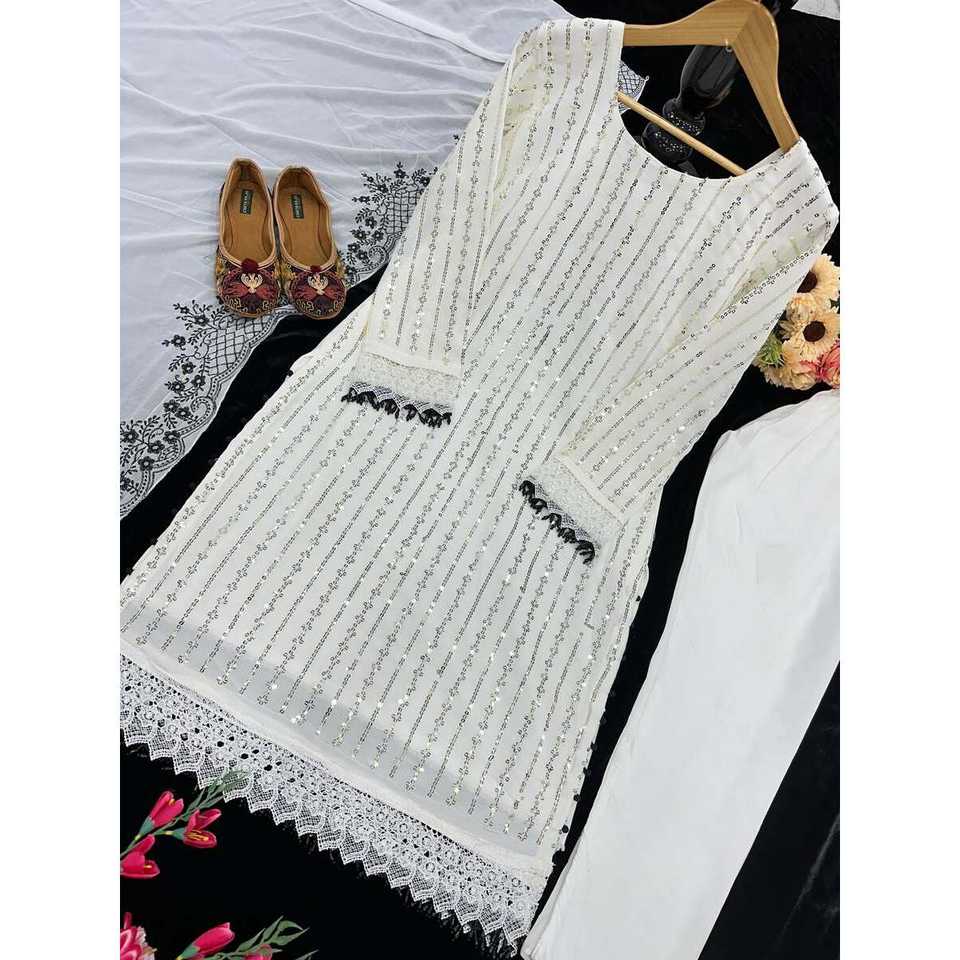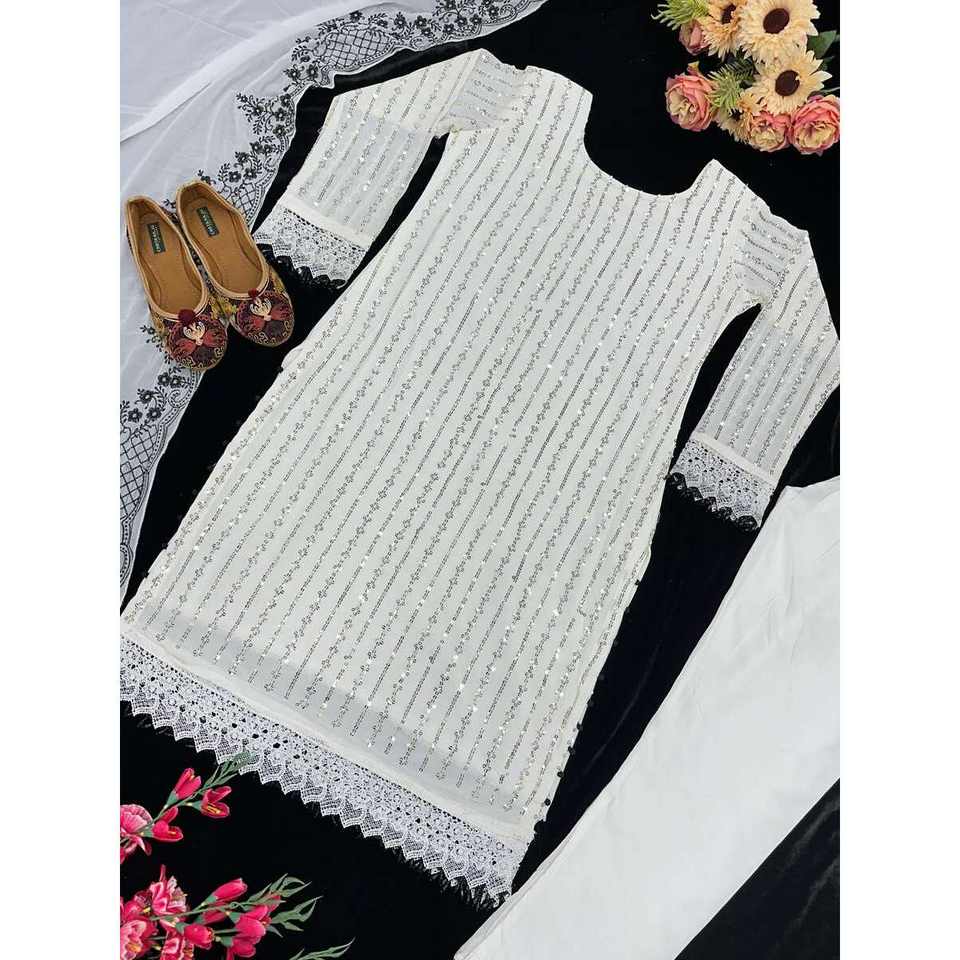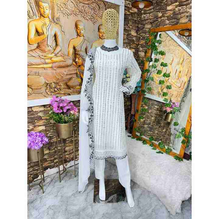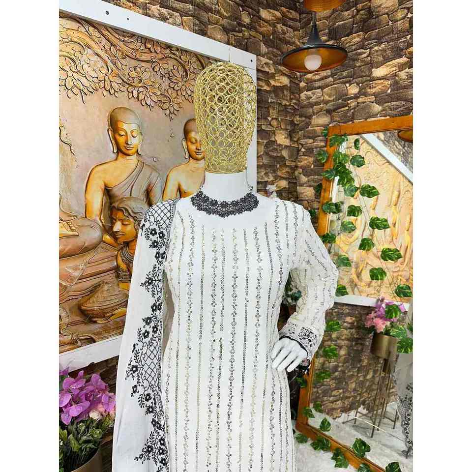ผ้าจอร์เจียเจ็ตปักลวดลายตามสมัยนิยมพื้นล่างสุดด้วยสีขาว