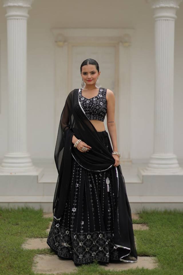 ชุดเลเฮนกาโชลีผ้าจอร์เจตต์ปักลายแฟชั่นสำหรับคนอ้วน พร้อมผ้าคลุมไหล่สีแดง แต่งลูกไม้ถัก กระดุมเพชร