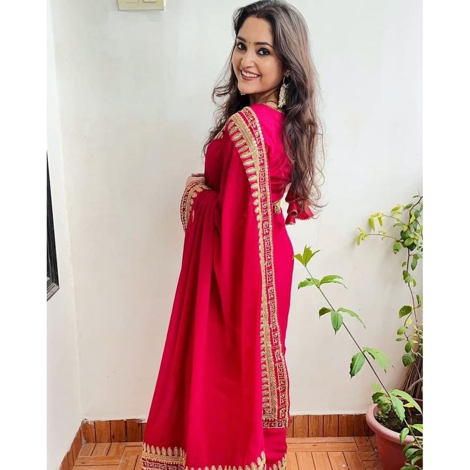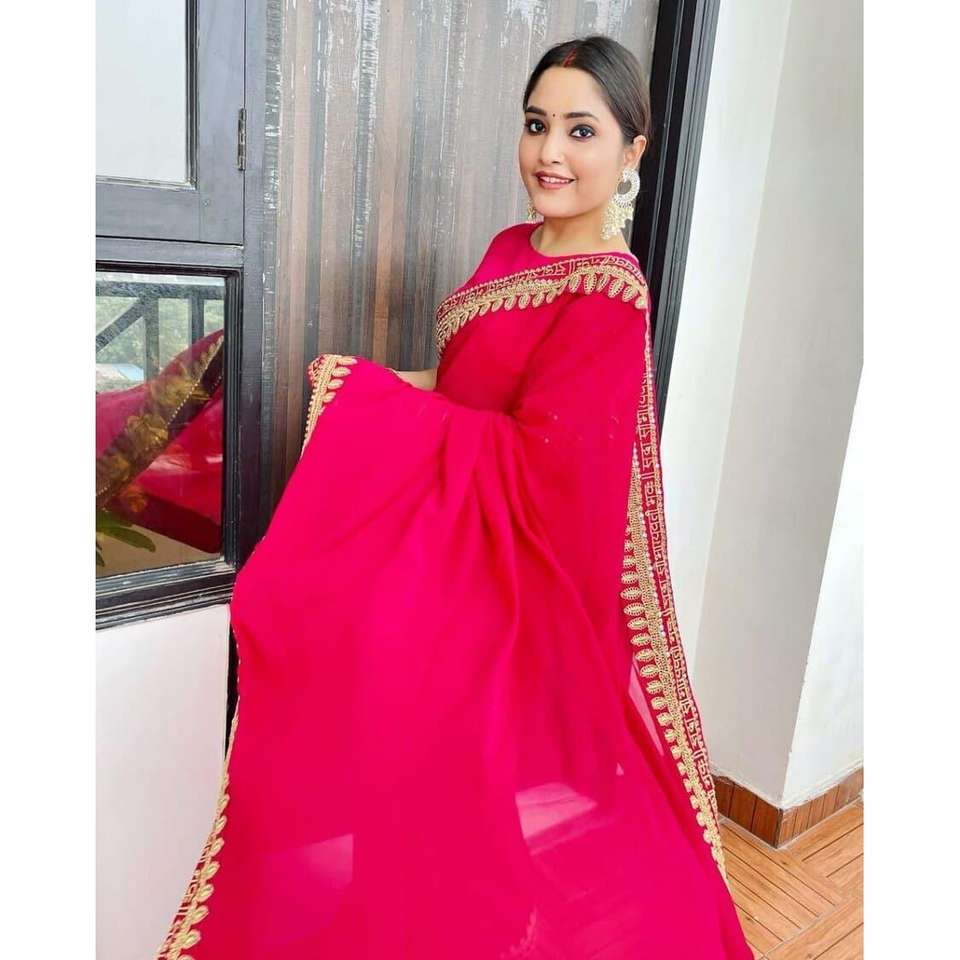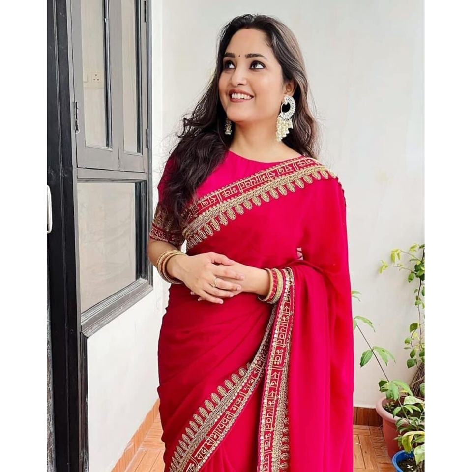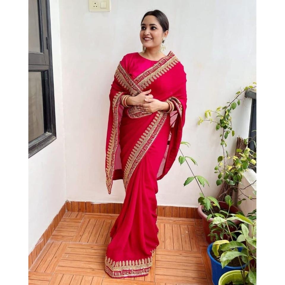 ผ้าส่าหรีงานปักลายผ้าจอร์เจียแบบมีหลายชิ้นสีชมพูแฟชั่น