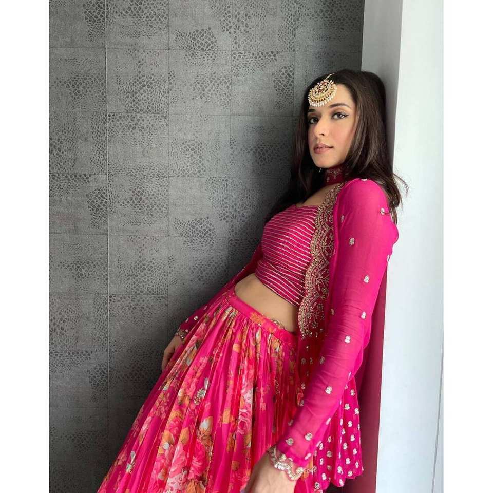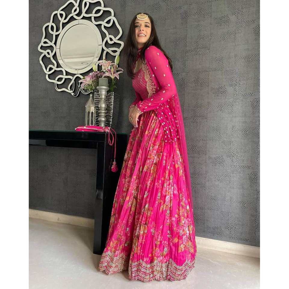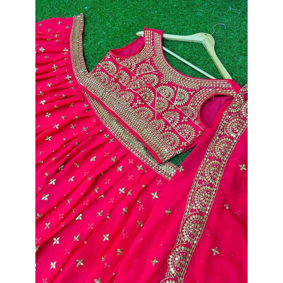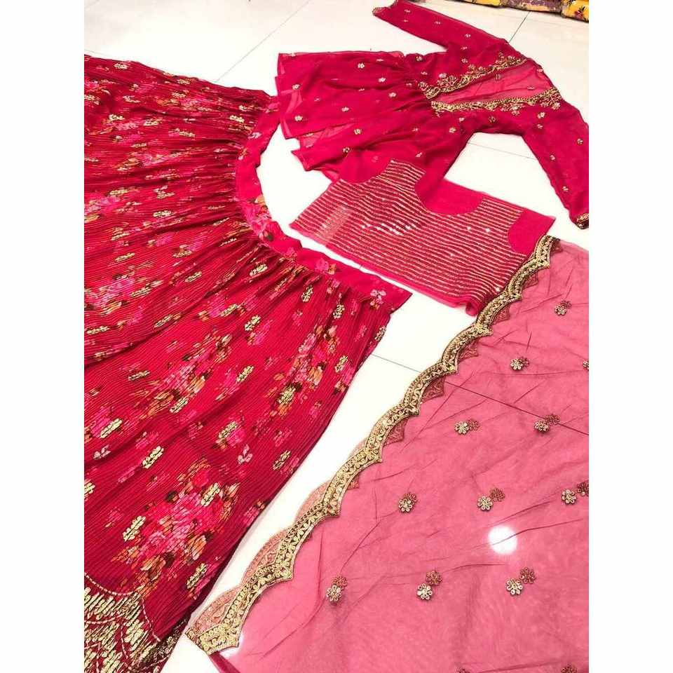 ผ้าจอร์เจียแฟชั่นพิมพ์ลายด้วยงานเย็บปักถักร้อย lehenga choli Koti กับ dupatta สีชมพู