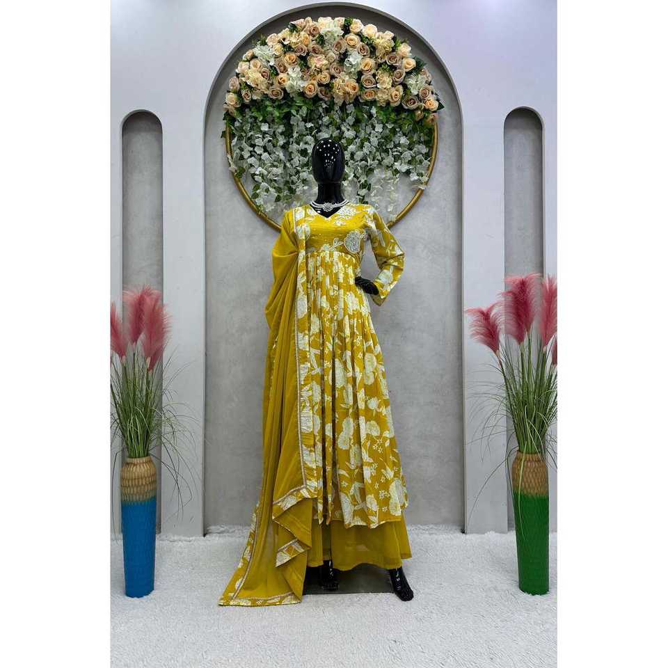 ภาพพิมพ์ดิจิตอลมัสลินทันสมัยพร้อมด้วยมือบนวังกับ dupatta มะนาว