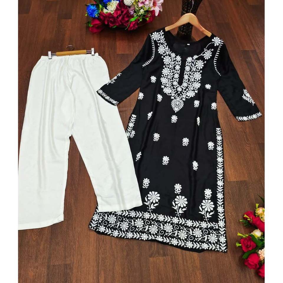 แฟชั่นผ้าเรยอนผ้าฝ้าย Chikankari ปักลายด้วยสีดำพาลาซโซ