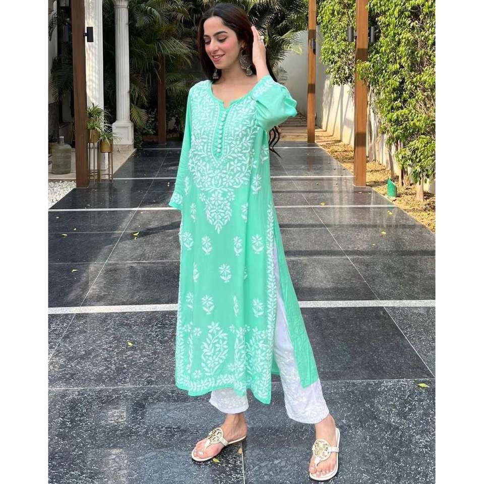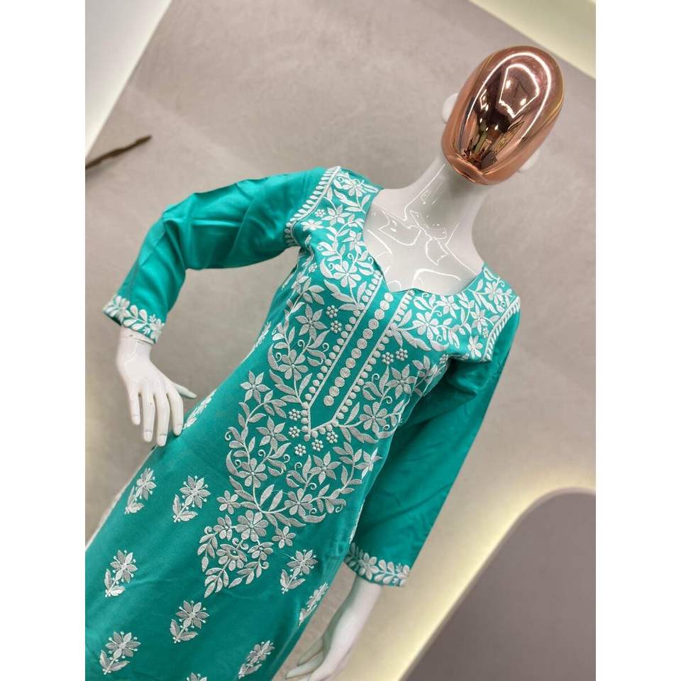 FASHIONABLE RAYON THREAD EMBROIDERY WORK KURTI WITH PALAZZO SEA GREEN