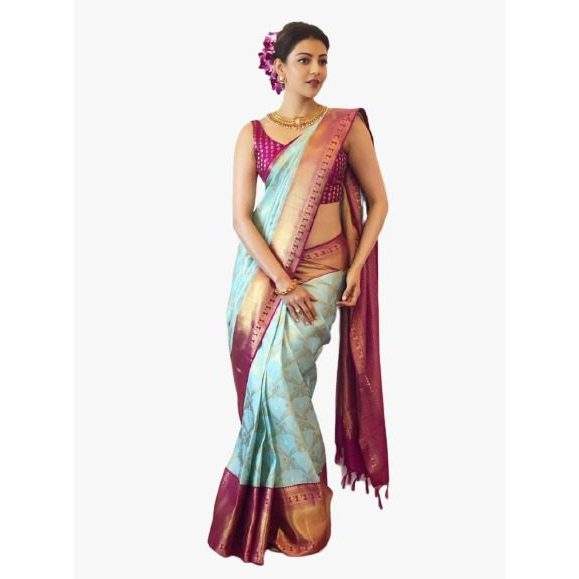 ส่าหรีผ้าไหมลายลิ้นจี่นุ่มทันสมัยพร้อมเสื้อเบลาส์สีเขียวน้ำทะเล