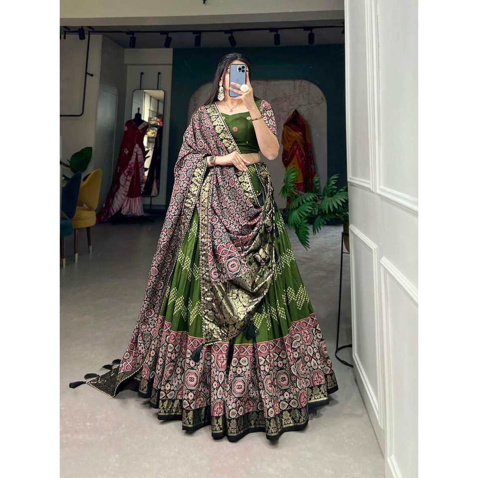 Lehenga choli พิมพ์ฟอยล์ผ้าไหมทัสซาร์ที่มีสีเขียว