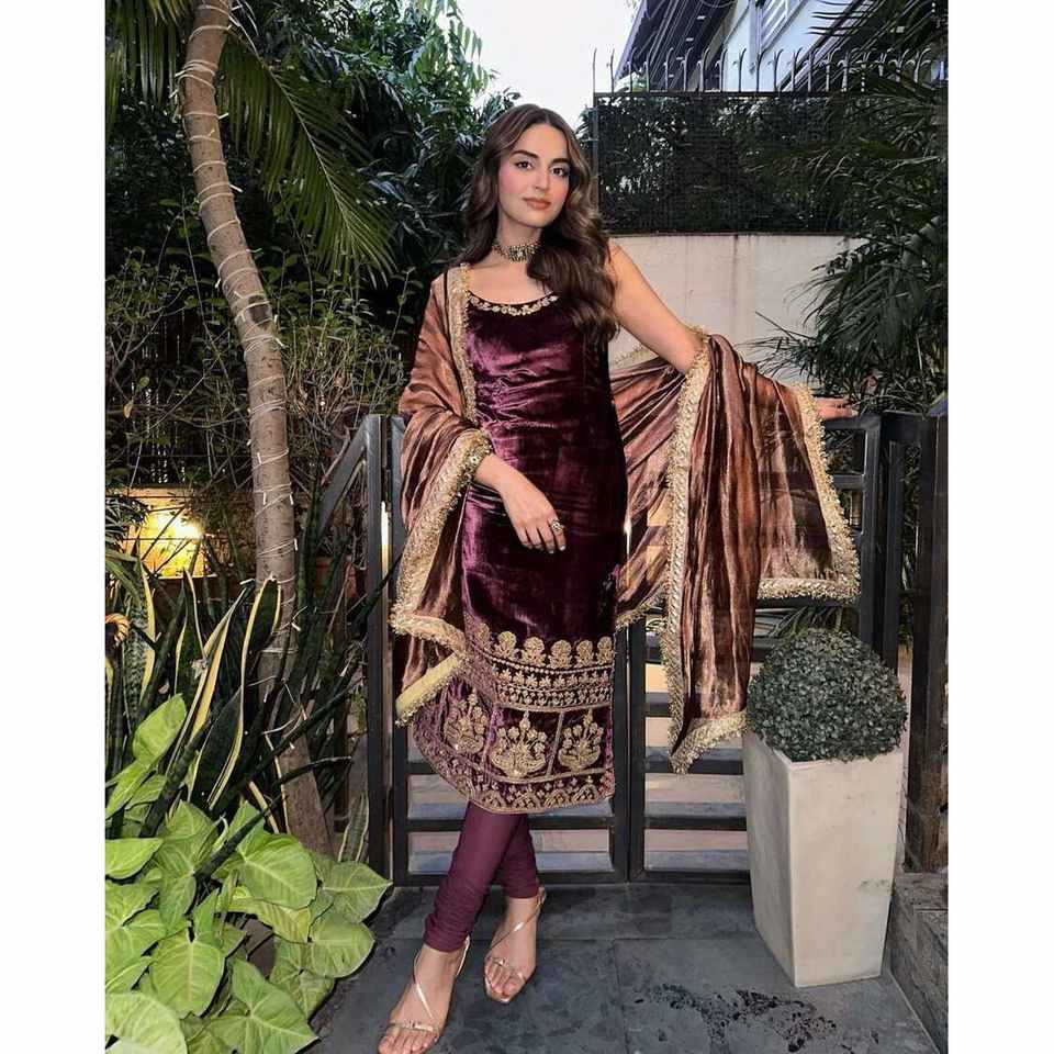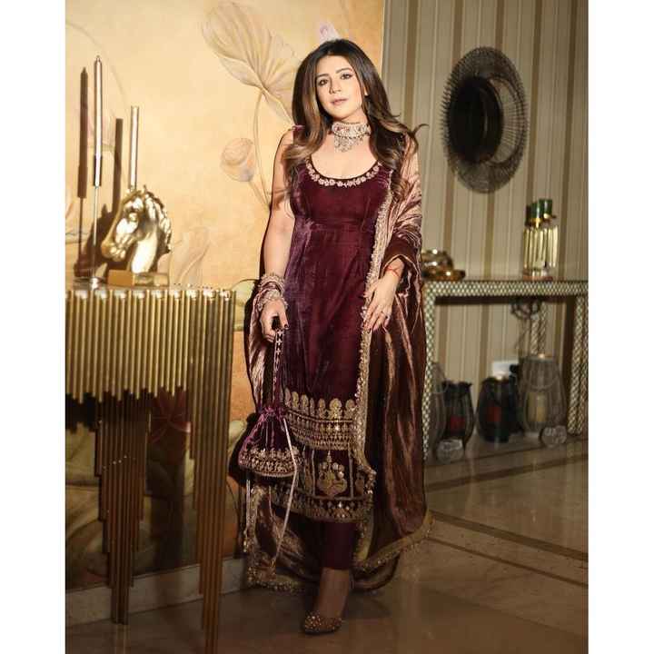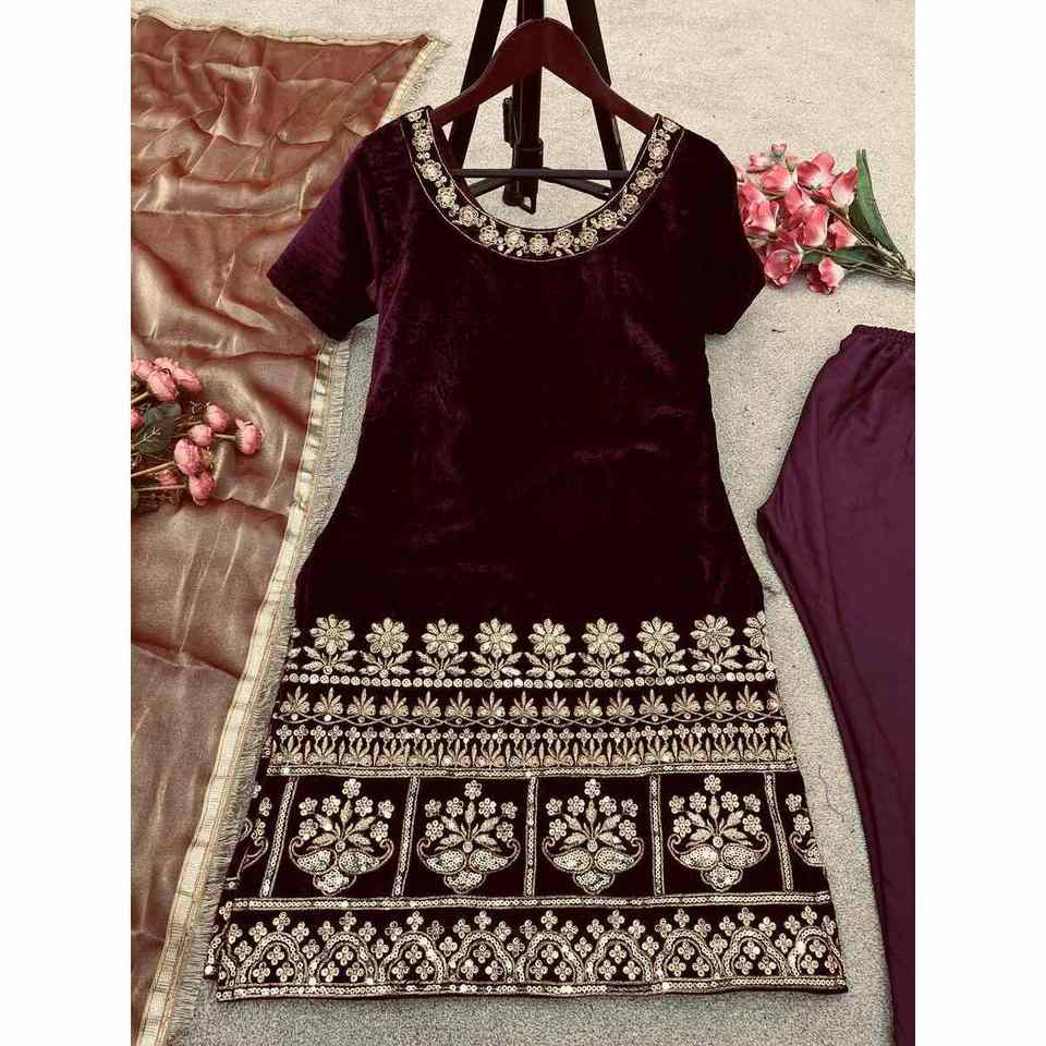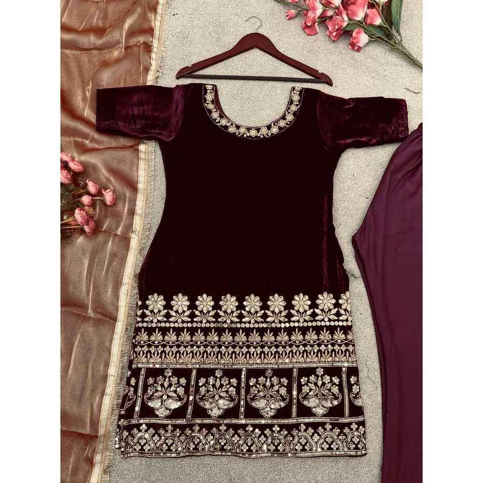 ชุดเสื้อและกางเกงผ้ากำมะหยี่ปักลายประดับเลื่อมสีน้ำตาล พร้อมผ้าคลุมไหล่